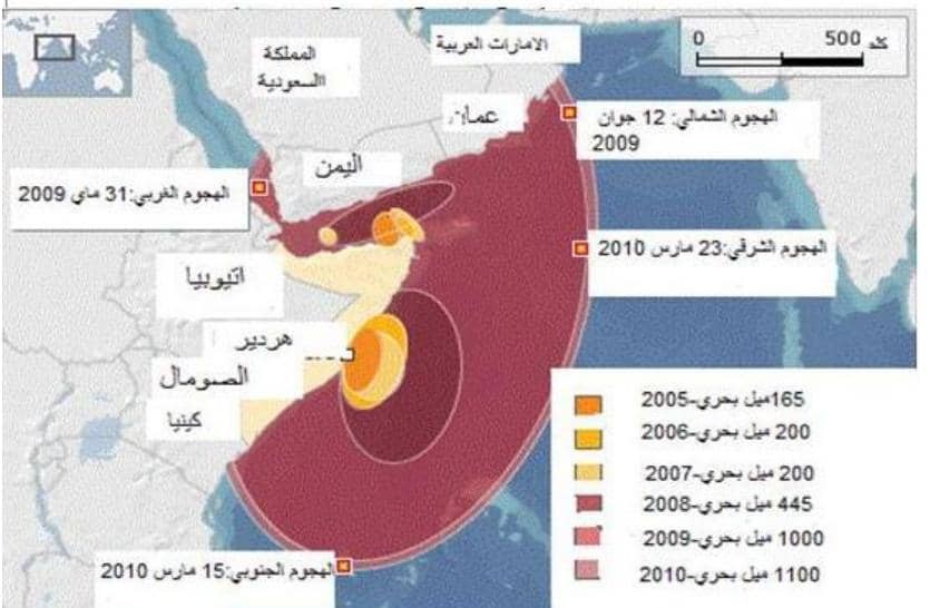خريطة رقم(1) توسع هجومات القرصنة على الساحل